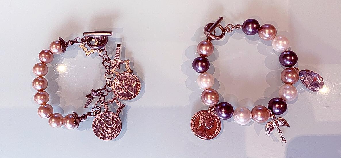 -Style: -Necklace: Adjustable Choker; - Light Peach & Light Peach + Dark Silver Pearl Bracelets with Charms