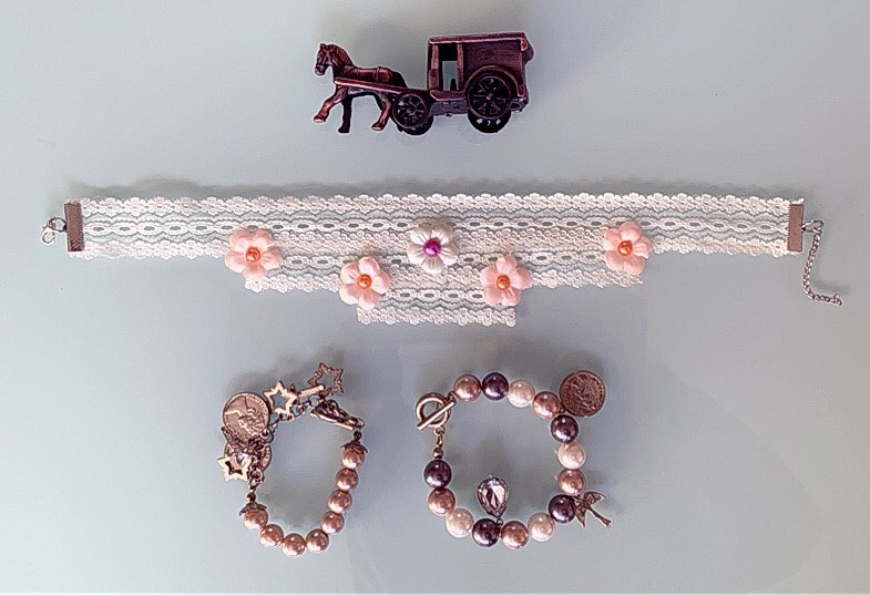 -Style: -Necklace: Adjustable Choker; – Light Peach & Light Peach + Dark Silver Pearl Bracelets with Charms